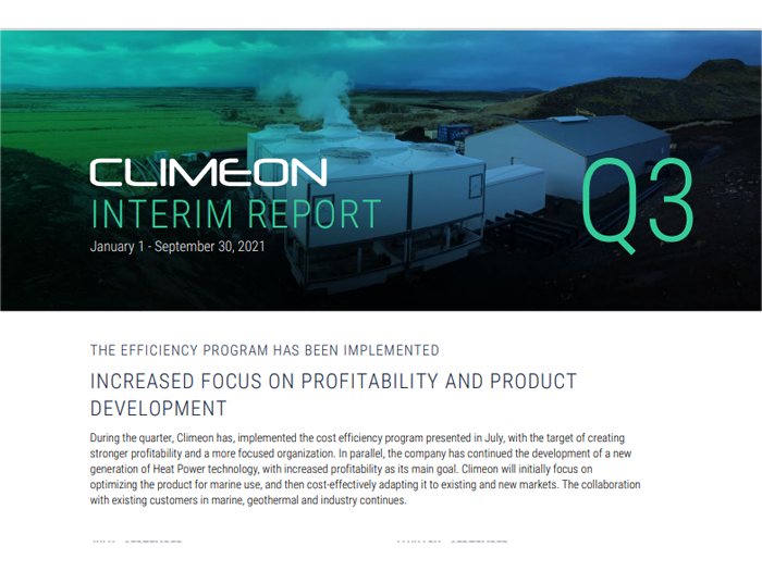 Climeon is a clean-tech vendor, providing a technology that uses the energy in waste heat from industries and low-temperature geothermal heat to generate electricity. The company received its first order in 2015 and has since then established a global customer base within maritime and industrial waste heat recovery and geothermal heat power. The product is protected by patents and offers market-leading performance within its areas of application.